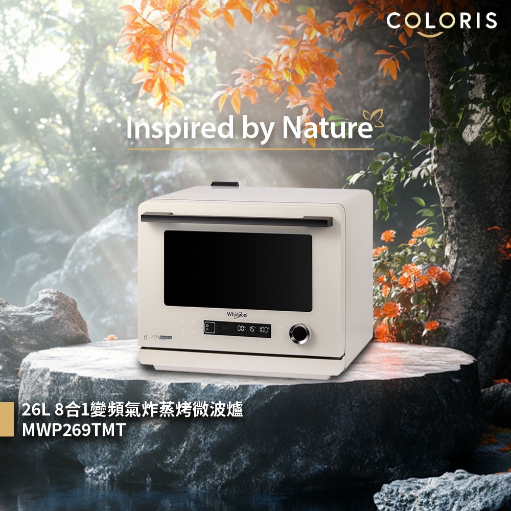 商品描述 | 【Whirlpool 惠而浦】Coloris系列 26L 8合一全能變頻氣炸蒸烤微波爐 雲霧白 (MWP269TMT):◆募資破百萬,全能烹飪神機◆6thSense精準溫控,烹調零失誤◆304不銹鋼內膽,安 |