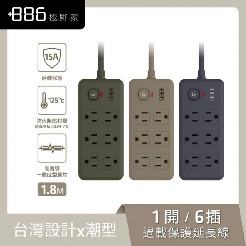 +886 [極野家] 1開6插 雙排過載保護延長線1.8米 V2 霧灰