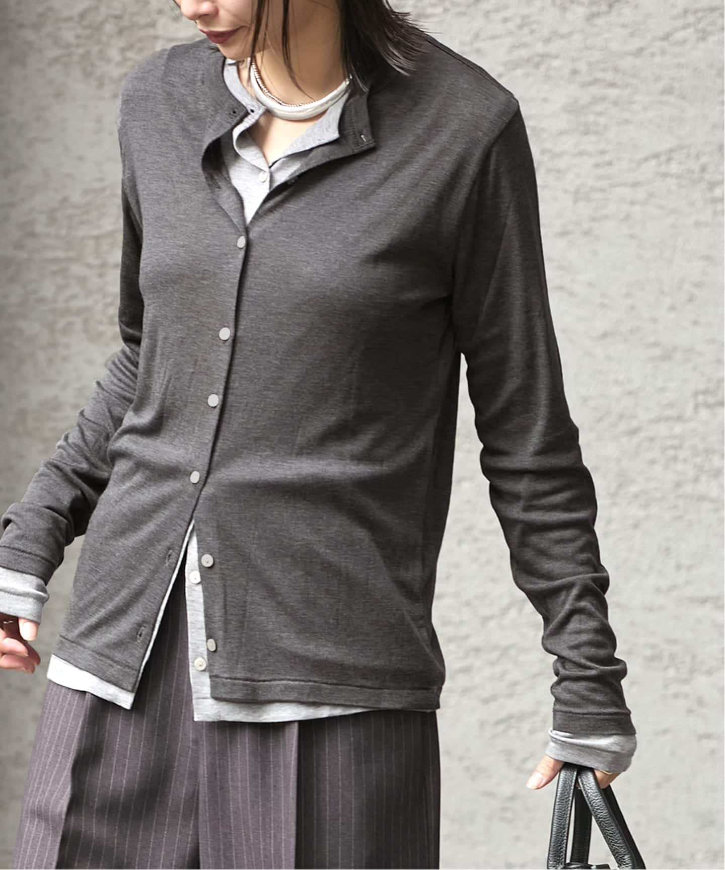 內容簡介 【2025年秋冬】JOURNAL STANDARD可一路穿到冬季的羊毛混紡基本款T恤系列混紡天絲材質,觸感柔軟舒適,帶有適度的微透感,這款緊湊剪裁的圓領開襟衫無論單穿或作為外套都可活躍於長季節穿搭中。剪裁適中,不會過度貼合身形,穿起來舒適自然。推薦與同系列的圓領套頭衫疊穿,打造色調一致的分層穿搭風格。作為內搭穿在持續受歡迎的寬褲或西裝外套內也非常合適,是一件萬用的針織上衣,擁有一件會非常方便。**********************■ 透明感:有■ 裡布:無■ 彈性:有■ 光澤感:無■ 布料厚度:薄**********************【工作人員試穿評論】《工作人員 O》年齡:30歲出頭 身高:158cm 體型:一般 平時穿M 試穿尺寸:FREE尺寸感:剪裁俐落,但不會太貼身,也不會有緊繃感。材質感:滑順柔軟的布料穿著感:觸感非常舒服,穿起來很舒適※以上為個人試穿感受,僅供參考。**********************※關於洗滌與保養方式,請參考商品上所附的品質標示。※由於拍攝時的燈光效果,商品實際顏色可能與照片略有差異。另外,因電腦與智慧型手機等設備的顯示設定不同,實際商品顏色可能與畫面略有出入。※商品的實際顏色請參考商品的特寫圖片。【穿搭資訊】黑色A、灰色、棕色著用模特兒:身高162cm,著用尺寸FREE紅色著用模特兒:身高160cm,著用尺寸FREE細節照模特兒:身高162cm,著用尺寸FREE尺寸資訊:FREE肩寬:36cm/胸寬:42cm/衣長:64cm/袖長:62cm[貨號:25070400354040]