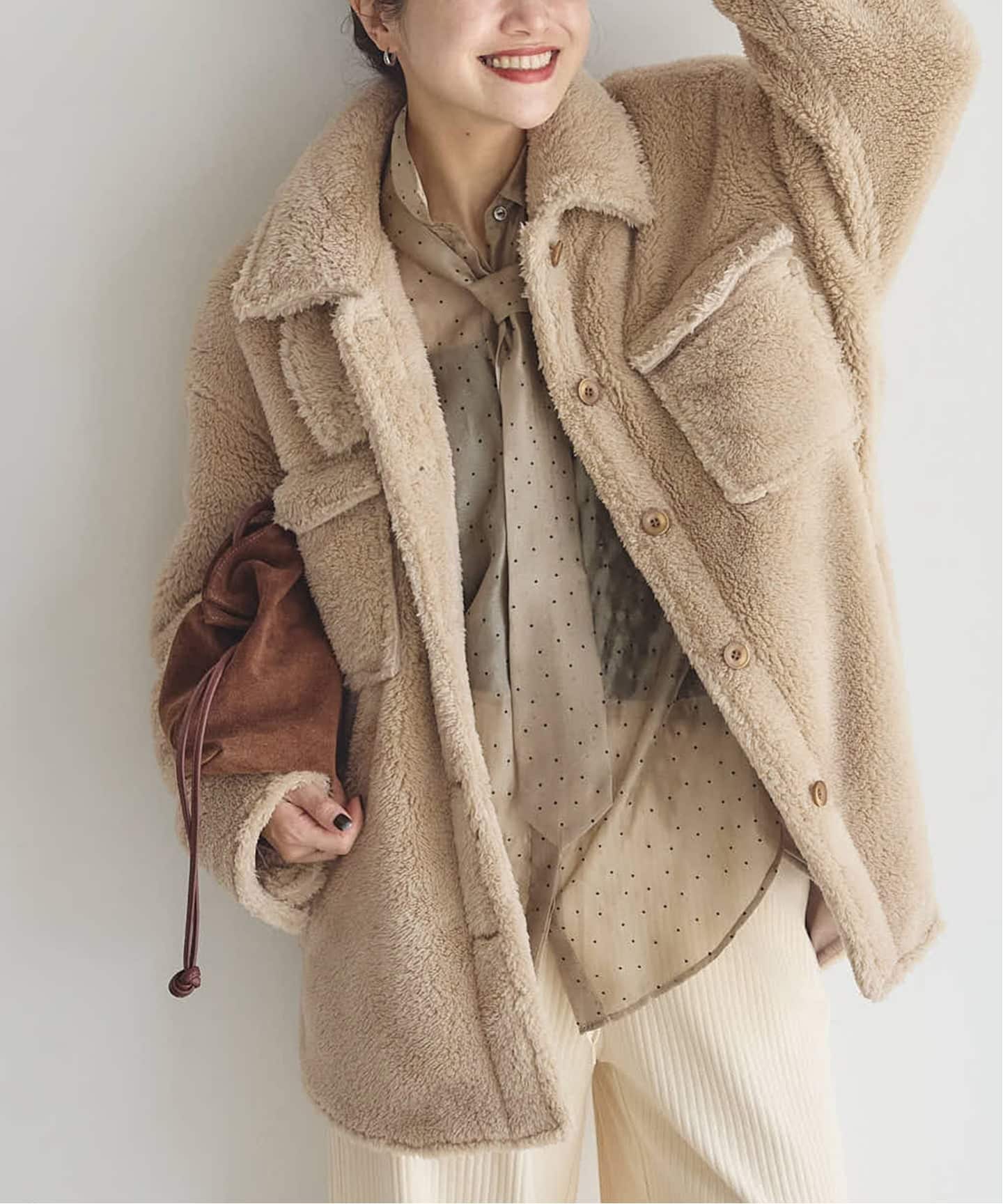 內容簡介 JOURNAL STANDARD以蓬鬆柔軟的軟質刷毛(Soft Fleece)素材製作的 CPO 夾克登場。採用法國 ECOPEL 公司的布料,觸感非常柔軟、重量輕盈。為中長版襯衫式外套的設計,簡潔好搭,隨性一披就很有造型感。雖然外觀看起來有份量,但實際上十分輕巧、穿著舒適。領口附有下巴擋片,可扣上變成類高領設計,即使到後期季節也能保暖穿著!**********************透膚感:無內裡:有彈性:無光澤感:無布料厚度:普通**********************【工作人員著用評論】《工作人員 O》年齡:30 多歲前半/身高:158cm/體型:普通/平時尺寸:M/著用尺寸:FREE尺寸感:寬鬆、具餘裕的版型材質感:柔軟、帶蓬鬆感、略有毛量的刷毛材質穿著感:輕盈好穿,適合隨時披上※以上為個人主觀感受。**********************※保養方式請以商品上的品質標示為準。※因拍攝光線影響,實際顏色可能與影像略有差異。不同的電腦與手機螢幕設定也可能使顏色呈現不同。※商品實際顏色請參考商品特寫圖片。黑色示範:身高 160/162cm/著用尺寸 FREE米色示範:身高 156/158cm/著用尺寸 FREE細節示範:身高 162cm/著用尺寸 FREE尺寸:FREE肩寬:55胸寬:62衣長:76袖長:54袖長(連肩):81.5袖口:30重量(g):770[貨號:25011400911040]