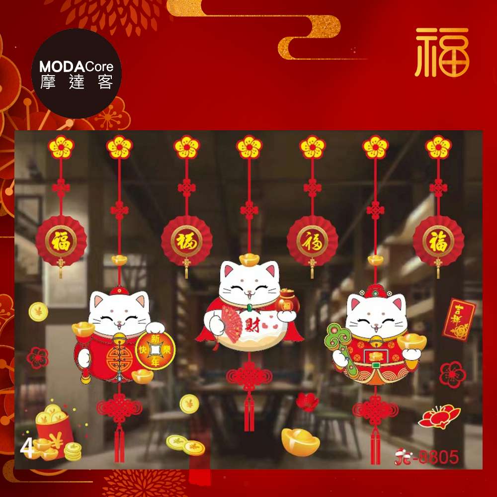 摩達客◉春節開運◉三福氣招財貓雙面靜電貼無痕窗貼玻璃貼