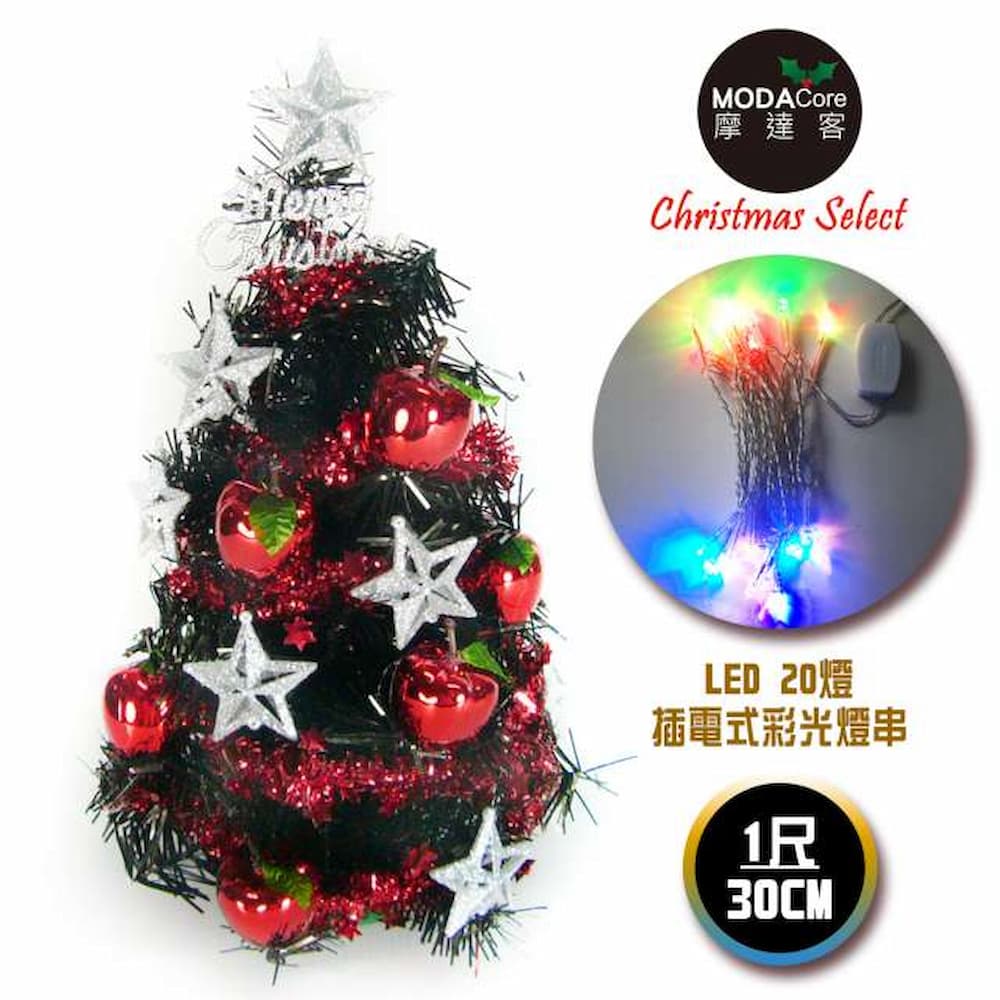 摩達客耶誕★台灣製迷你1呎 1尺(30cm)銀星紅果裝飾黑色聖誕樹+LED20燈彩光插電式(樹免組裝)