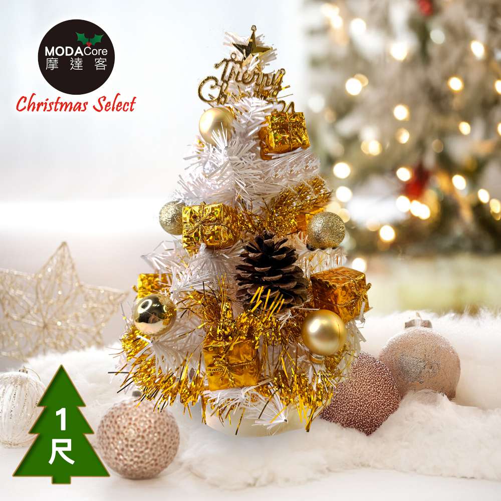 摩達客-台灣製1尺(30cm)精緻白色聖誕樹 巴黎金夢禮物系裝飾品組不含燈(免組裝) 耶誕禮物