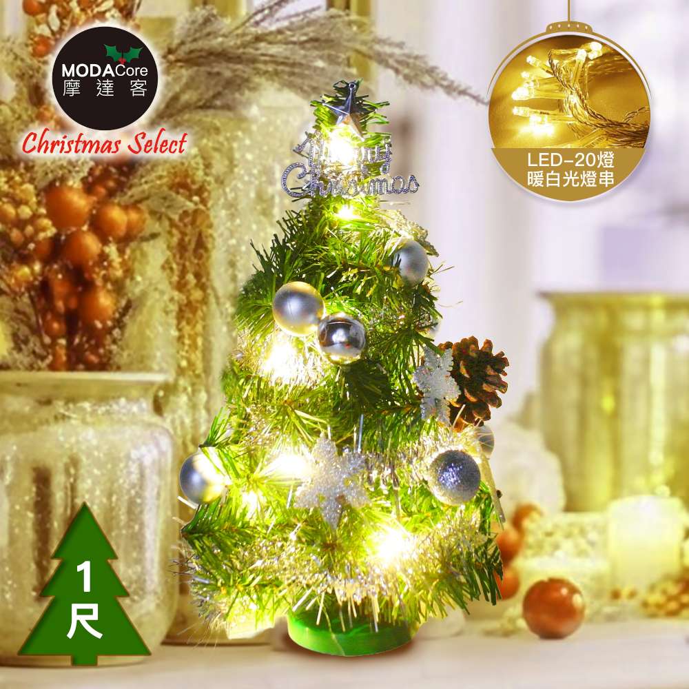 摩達客-台灣製1尺(30cm)精緻綠色聖誕樹 銀雪詩人系裝飾品組不含燈(免組裝)+20燈LED銅線燈串暖白光-USB電池盒兩用充電 耶誕禮物