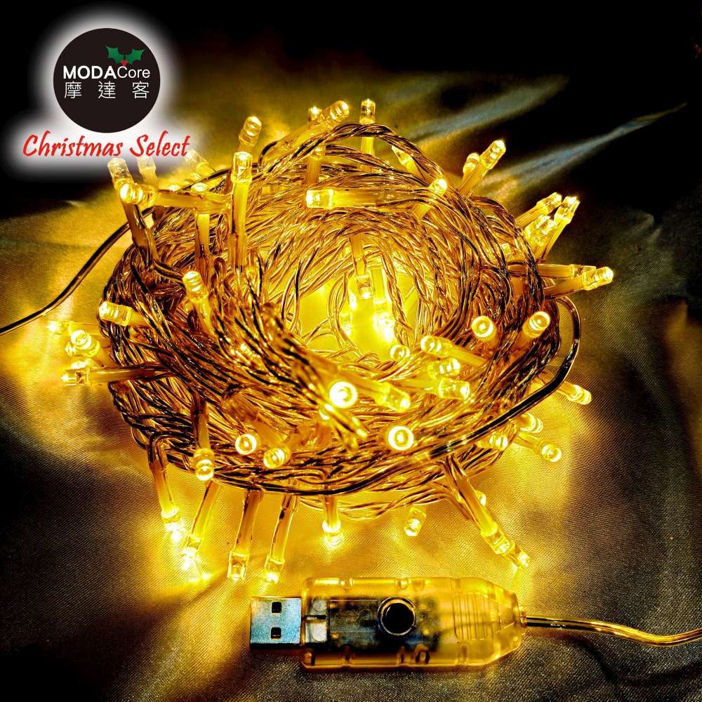 摩達客-浪漫療癒200燈LED高亮度透明線聖誕燈樹燈串-暖白光(USB充電接頭+控制器)