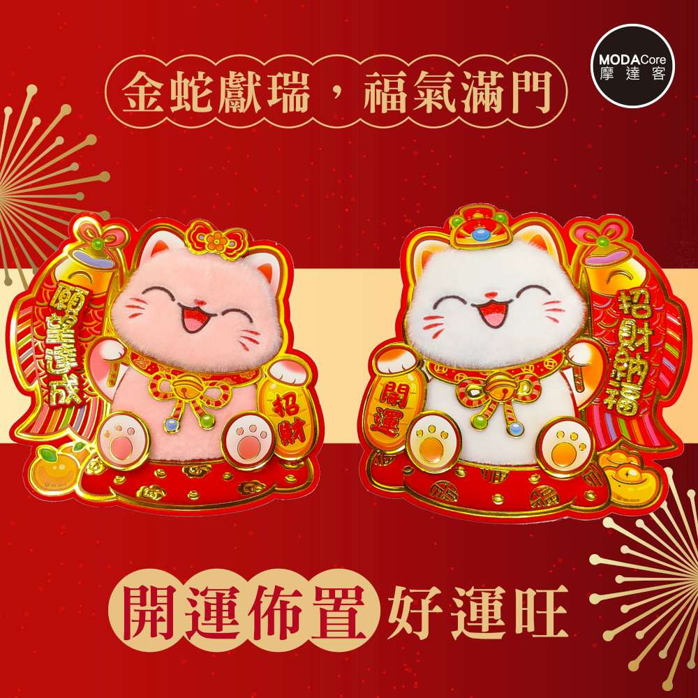 摩達客◉春節開運招財◉毛毛粉白願望招財貓鯉魚旗門聯對聯春聯兩片組