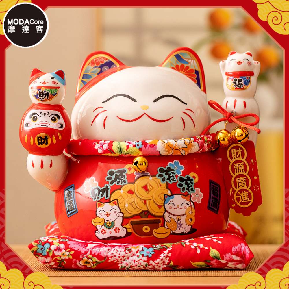 摩達客◉春節開運招財◉紅色財源滾滾達摩招財貓(含坐墊)_撲滿存錢桶擺飾桌飾