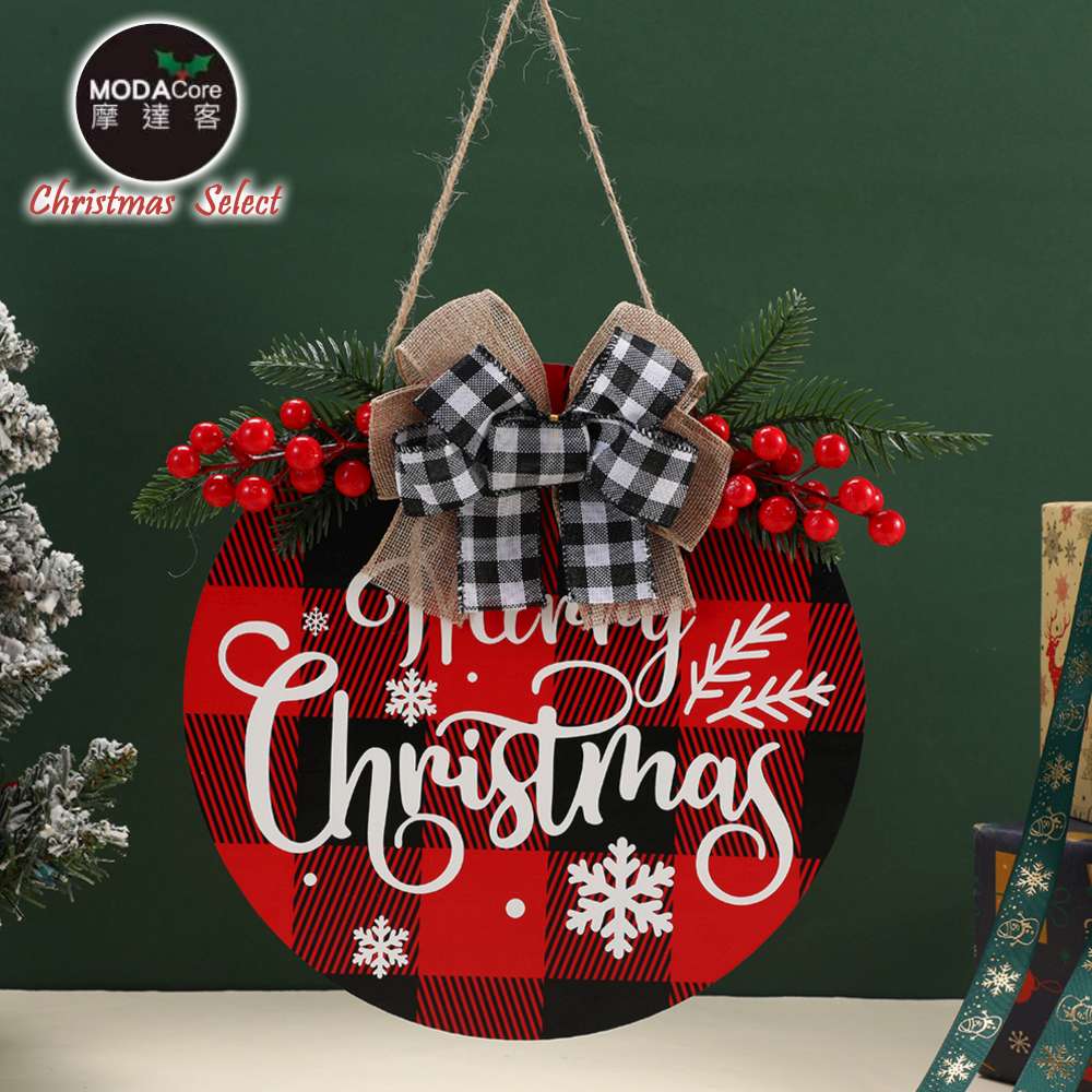 摩達客耶誕-木質紅黑格紋紅果聖誕快樂吊飾(單面)