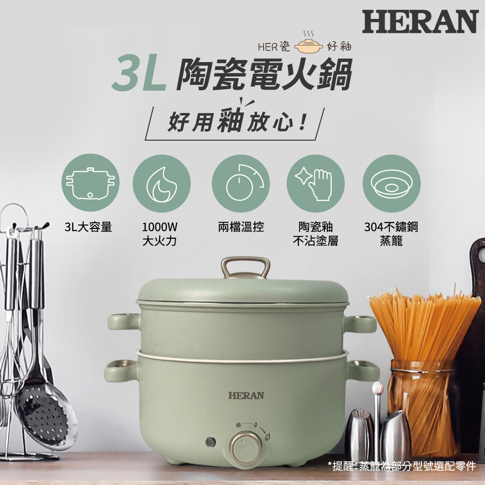 【官方直營】HERAN 禾聯 3L料理美食蒸煮陶瓷電火鍋-附不鏽鋼蒸籠(外宿租屋上班小資族首選 HHP-10SP01S)
