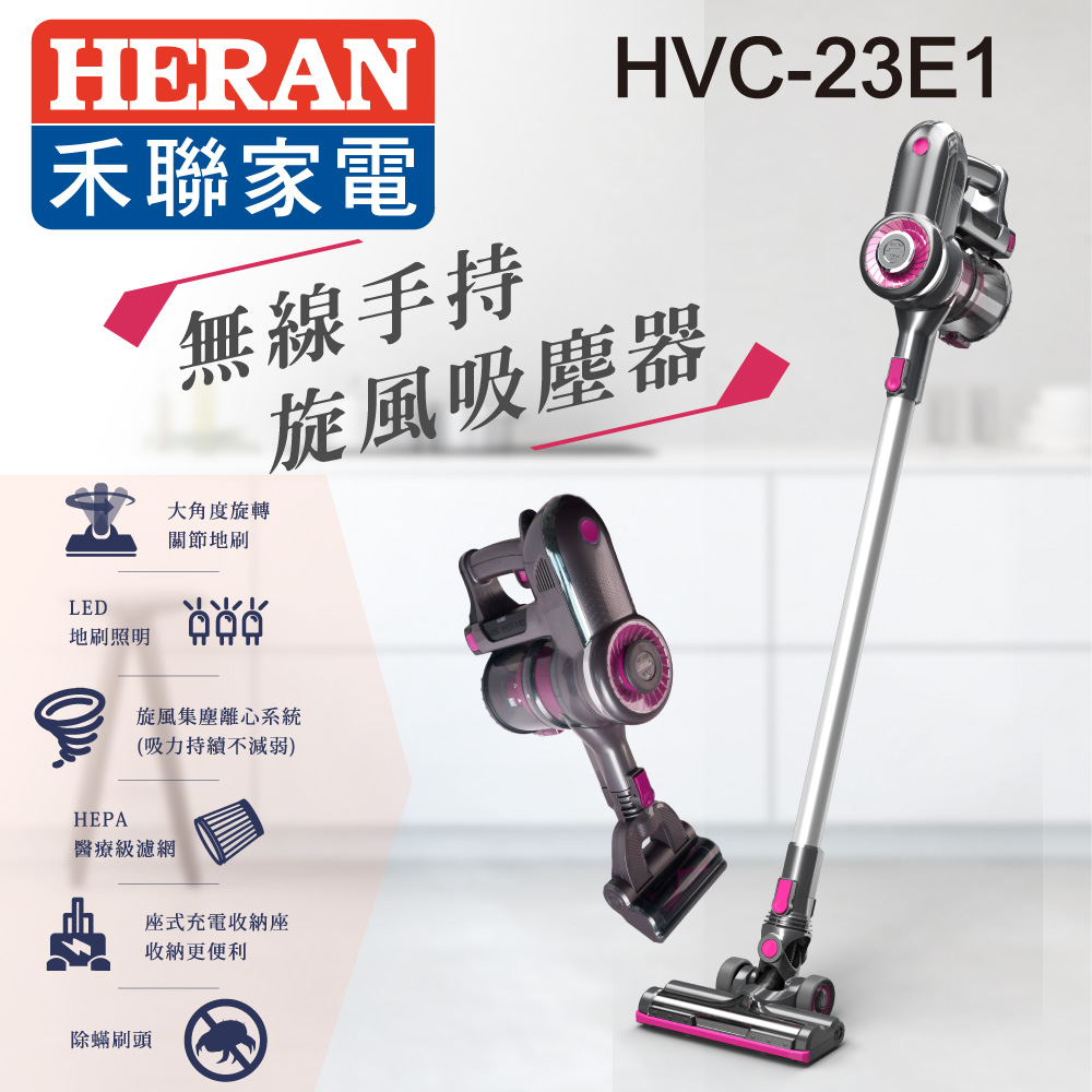 商品描述 | 【官方直營】HERAN禾聯 無線手持旋風吸塵器(HVC-23E1):●無線輕巧手持/直立●大角度旋轉關節地刷●LED地刷照明●炫風集塵離心系統●HEPA醫療級濾網●坐式充電收納座●除螨 |