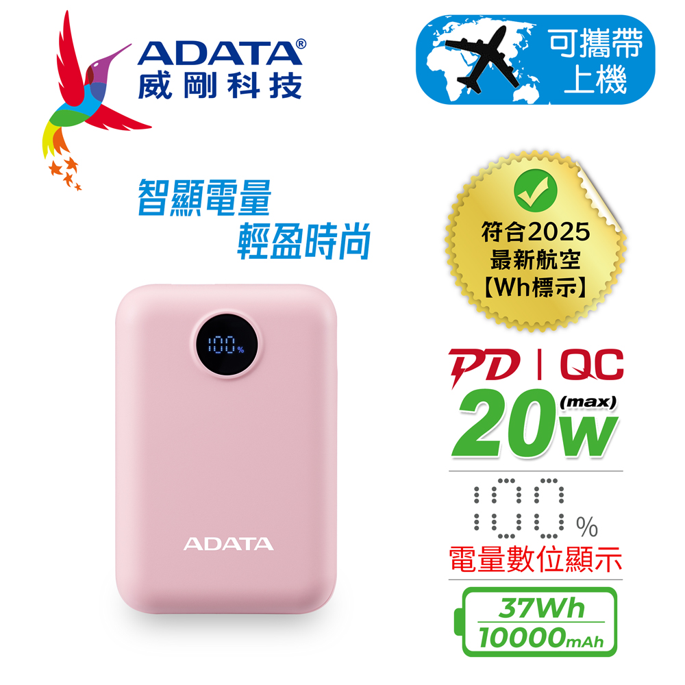ADATA 威剛 C100 Digital Display 10000mAh PD QC 20W 極速快充 行動電源(電量數位顯示)-櫻花粉