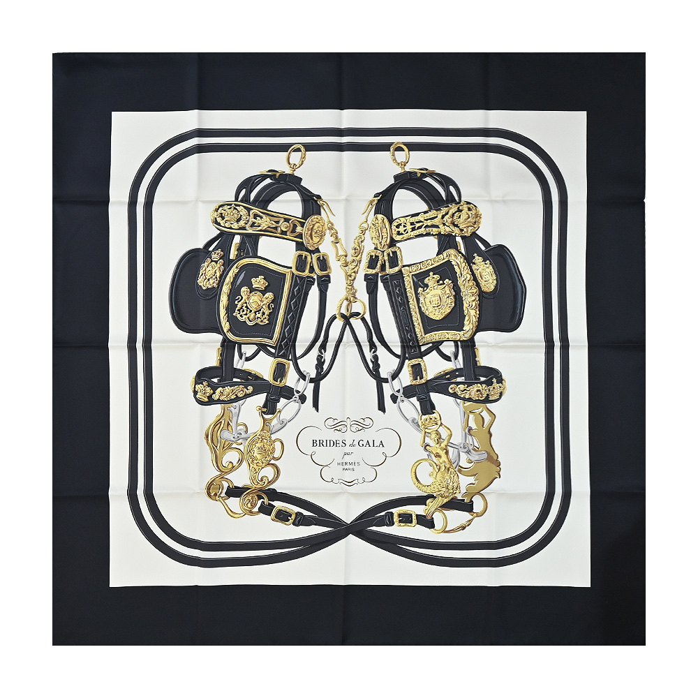 Hermes 愛馬仕 Brides de Gala 90 cm典藏手工捲邊斜紋真絲方巾(黑 奶油 金) 平行輸入