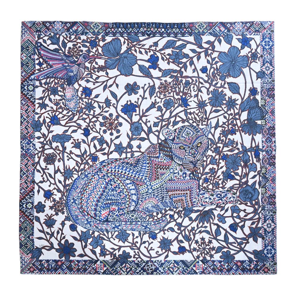 Hermes 愛馬仕 Le Jaguar et Le Colibri 140 cm手工捲邊喀什米爾與真絲混紡方巾(雲紋灰 藍 深棕紅) 平行輸入