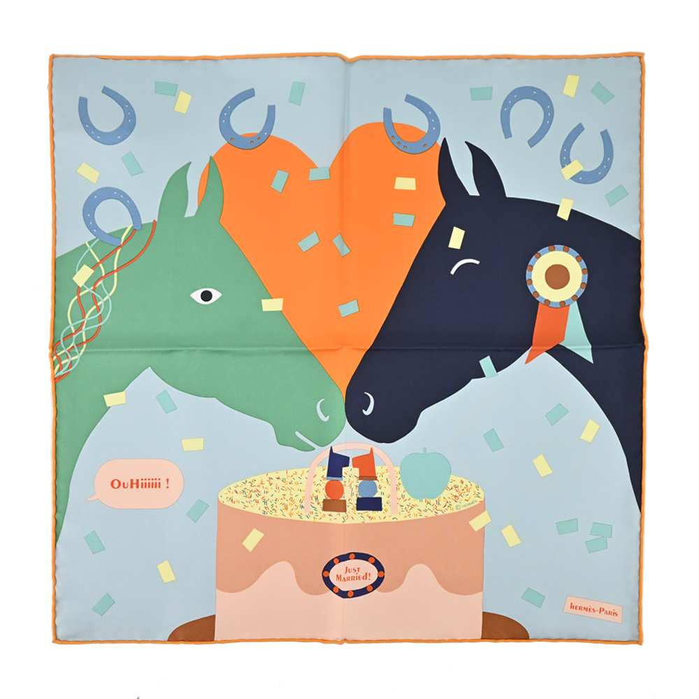 Hermes 愛馬仕 Just Married 45cm手工捲邊斜紋真絲方巾(水藍 橙 玫瑰粉) 平行輸入