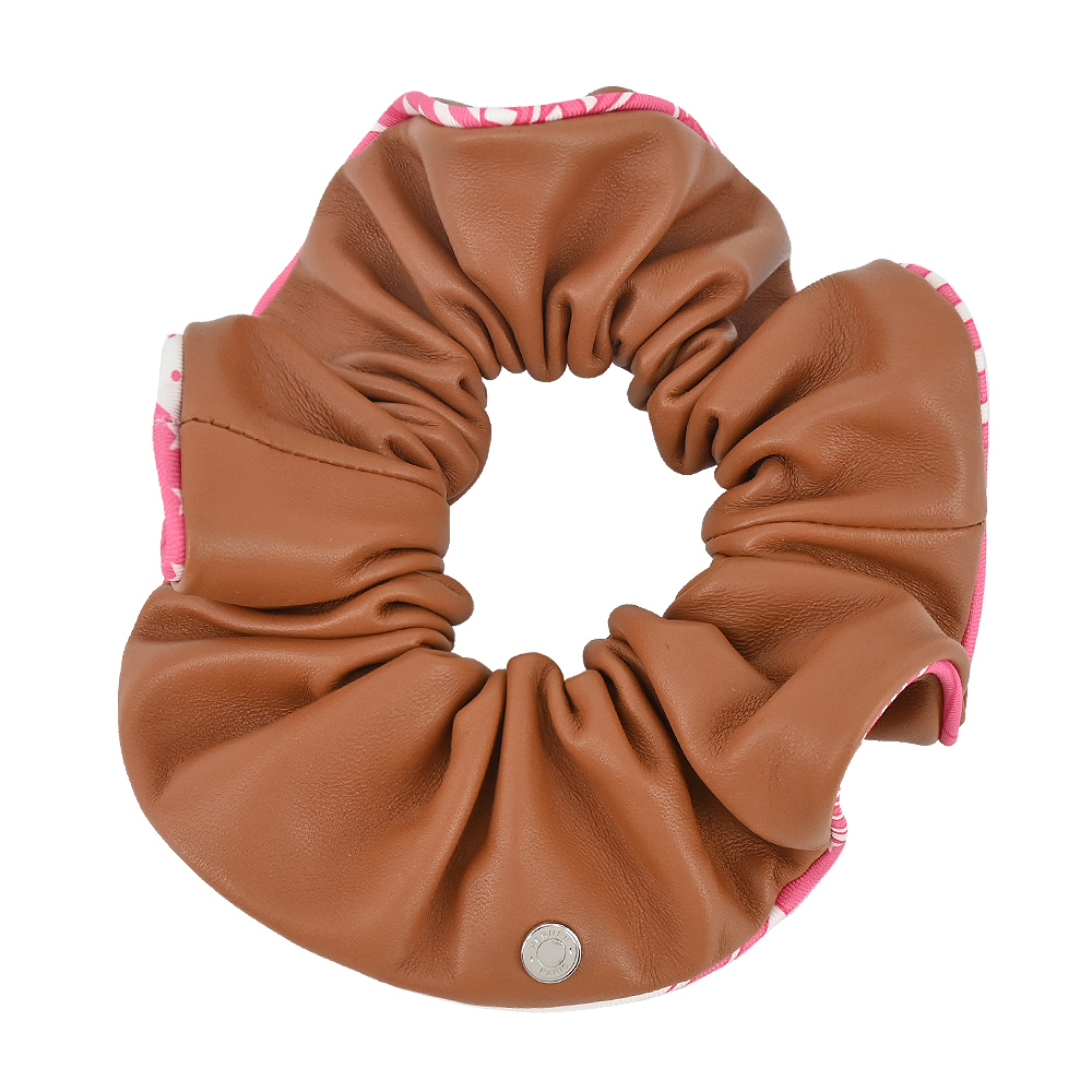 商品名 / | Hermes 愛馬仕 Claudia Sangles en Zigzag Bandana 印花絲質斜紋滾邊小羊皮髮圈(金 玫瑰杜鵑花) 平行輸入 |