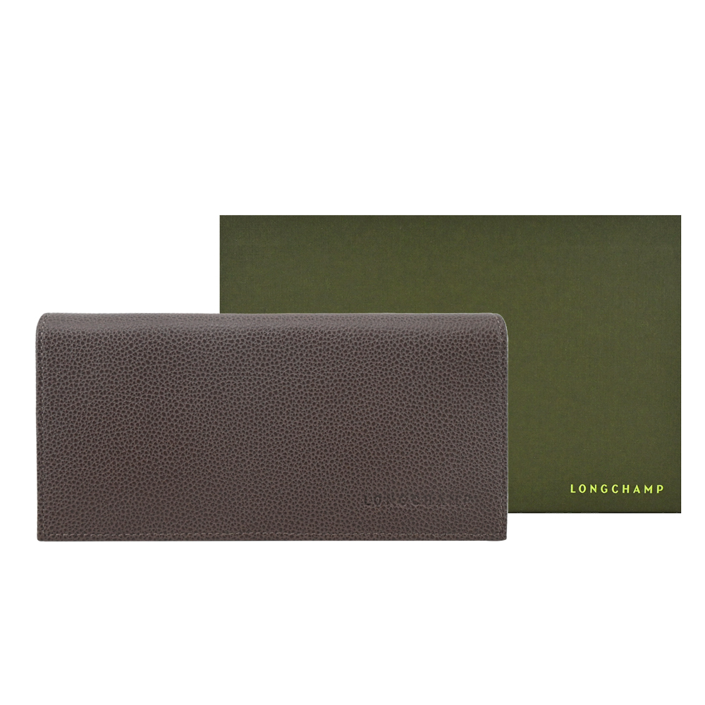 LONGCHAMP LE FOULONNÉ系列牛皮簡約翻蓋14卡壓釦長夾(駝灰) 平行輸入