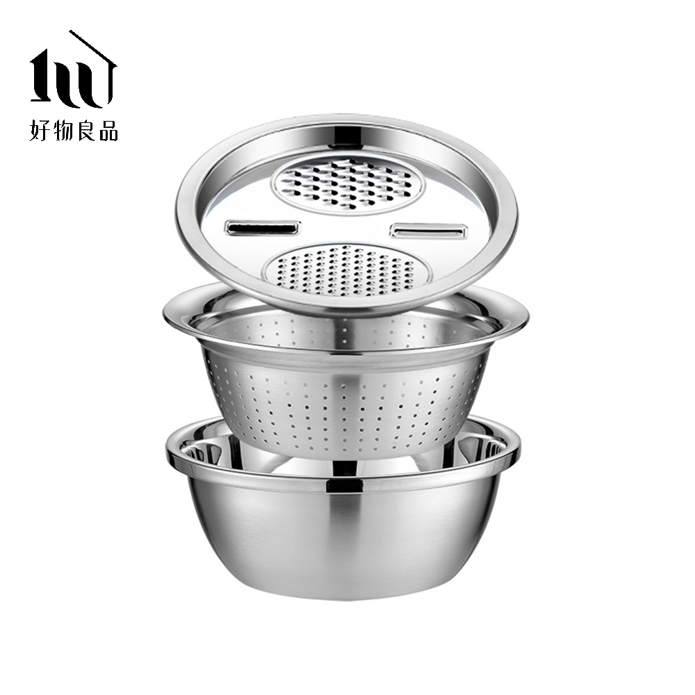 商品描述 | 【好玩旅物】食品級304不鏽鋼刨絲洗菜煮湯三件套鍋組:1.食品級304不鏽鋼-安心使用,耐摔耐髒耐壓不會鏽蝕2.瀝水快速-洗菜洗米,浸泡醃漬皆可使用,煮麵可快速瀝水3.可煮湯 |