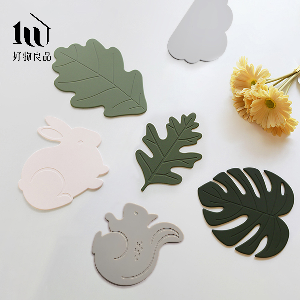 【好物良品】4入組_韓國簡約可愛矽膠卡通可水洗隔熱杯墊 松鼠*1、雲朵*1、 兔子*1、龜背竹*1