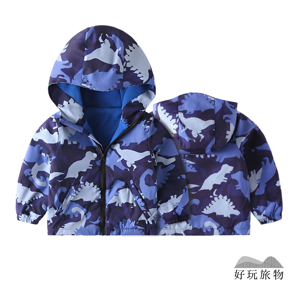 【好玩旅物】內刷毛防水防風兒童衝鋒外套 120碼 藍色恐龍