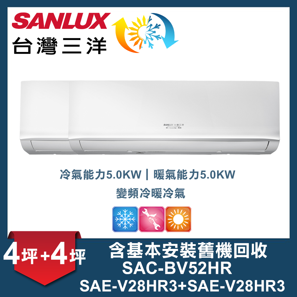 【SANLUX 台灣三洋】 4坪+4坪變頻冷暖分離式一對二冷氣 (SAC-BV52HR+V28HR3+V28HR3)
