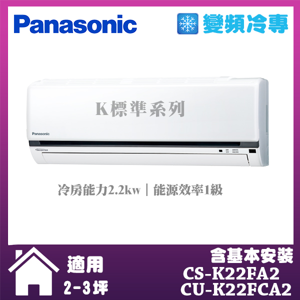 【Panasonic 國際牌】K標準系型2-3坪變頻冷專分離式冷氣 (CS-K22FA2 CU-K22FCA2)