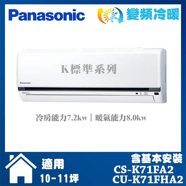 【Panasonic 國際牌】K標準系型10-11坪變頻冷暖分離式冷氣 (CS-K71FA2 CU-K71FHA2)