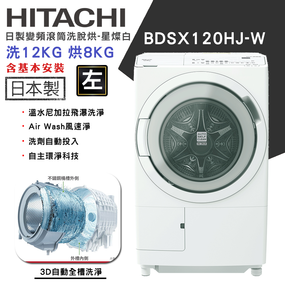 【HITACHI日立】12KG 日製AI智能感測變頻左開滾筒洗脫烘洗衣機(BD-SX120HJ-W)
