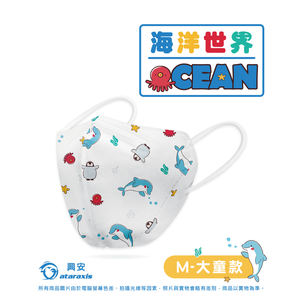 簡介 / 【興安】兒童3D立體醫用口罩 海洋世界大童 50入 1盒:1.『印花層』=非織物不織布,無可遷移性螢光劑、無偶氮染料2.『表面層』=PP不織布,潑水、防止口沫、霧氣滲入3.『中間