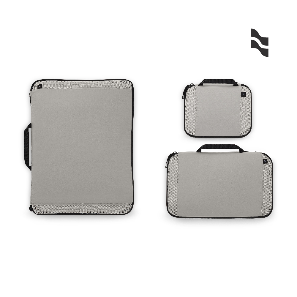 內容簡介 這款打包套件附有一個特大型(XL),一個大型(L)和一個中型(M)的收納袋,可按類型、服裝或旅行者整理各種衣物。配備壓縮拉鍊,有效減少體積、釋放行李空間,特別適合收納厚大的衣物。無論是旅行途中或季節換裝,都能讓收納更省力、更高效。可以裝入洗衣袋後使用洗衣機清洗,讓您每次旅行都能保持清潔。此系列全面使用回收的起皺尼龍與聚酯纖維,包裝使用的是100%GRS認證回收紙,還可全回收。