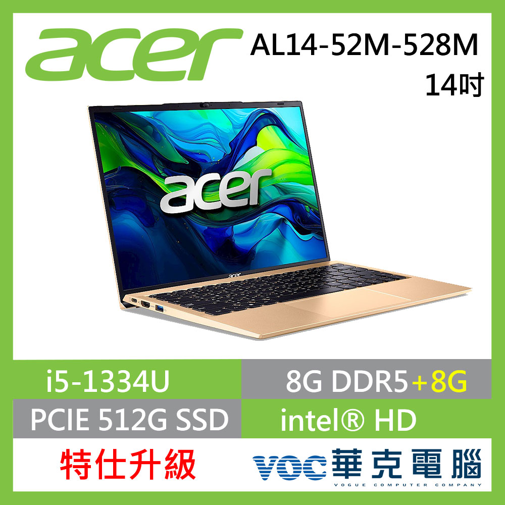 內容簡介 Intel Core i5-13代處理器 內建 Windows 11 Home作業系統螢幕:14吋16:10 WUXGA 1920x1200 高清螢幕 FHD前鏡頭超便攜的筆電 16.9mm薄型機身,輕僅1.5kgspec version:v5-0-5AI PN:NX.J5BTA.001型號:AL14-52M-528M作業系統:Windows 11 HomeCPU:CPU:Intel® Core™ i5-1334Uclock Turbo:1.3 GHz 4.6 GHzCores Threads:10 12Smart Cache:12 MB晶片組:NLCD :尺寸 規格:14.0" IPS 16:10 霧面 LED背光解析度:WUXGA 1920 x 1200色域:NTSC 45%亮度:300 nits:顯示晶片:Intel® HD GraphicsVRAM:N散熱設計:風扇:1熱導管:1記憶體:實際出貨:8GB DDR5+8G支援容量(總插槽數量 總容量):2 32GB儲存空間:實際出貨:512GB PCIe Gen4 SSD支援擴充空間(包含已安裝部分):M.2 SSD *1光碟機:Audio:Acer TrueHarmony:DTS® Audio:Acer Purified.Voice:built in speaker:YBuilt-in microphone:Y鍵盤:無背光Webcam:2M FHD Camera"無線網路:Wi-Fi 6802.11a b g n acR2+axDual Band (2.4 GHz and 5 GHz)2x2 MIMO"藍牙:Bluetooth® 5.1區域網路RJ-45:NKensington lock slot:Y尺寸(mm):313.3 (W) x 218 (D) x 16.9 16.9 (H) mm材質:A D蓋金屬重量:1.5 kg電源變壓器:65W Type C電池:58Wh batteryBattery Life:Input OutputCard Reader:Y(microSD™ Card reader)USB Type-C:1(USB 3.2)(DisplayPort)Type-C 支援影像傳輸:YUSB Type-A:3(USB 3.2 Gen 1)HDMI:Y(HDMI 1.4)External display (VGA) port:NDisPlay Port:N可外接螢幕數量:2耳機 喇叭輸出:Y(與耳機 喇叭輸出共用jack)麥克風輸入:Y(與耳機 喇叭輸出共用jack)安全指紋辨識:NTPM:N保固:台灣2年附贈配件:不附鼠包