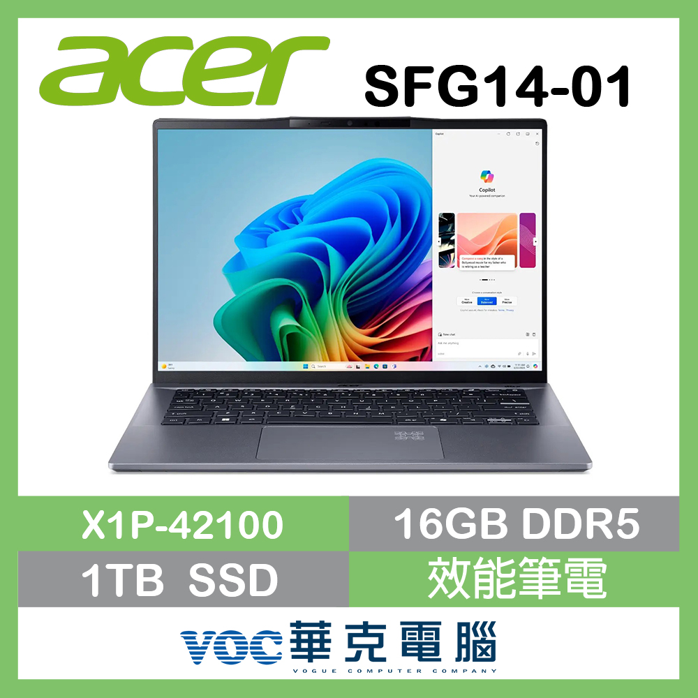 acer 宏碁Swift GO 14 AI SFG14-01-X2EE 14.5吋 文書筆電 灰(X1P-42-100 16G 1TB SSD W11 14.5)