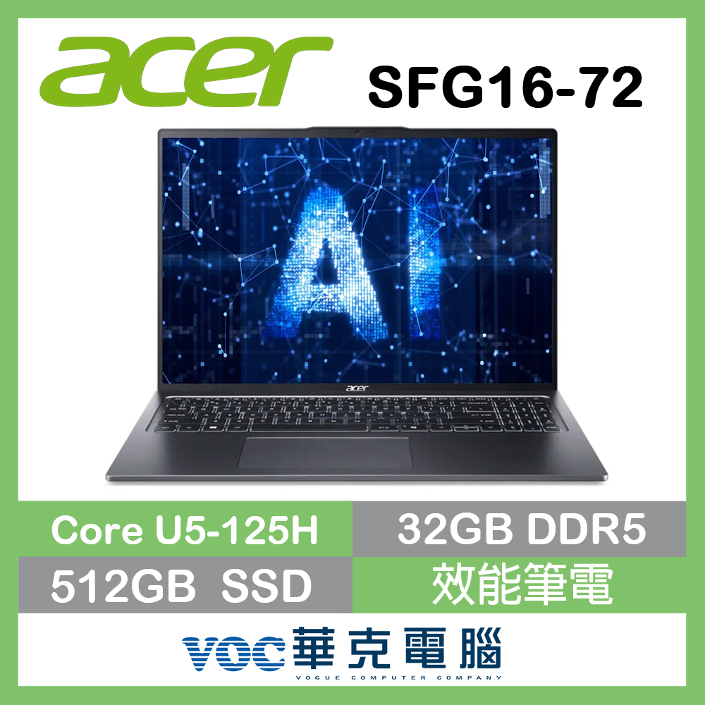 acer 宏碁Swift Go SFG16-72-57WR 灰(Ultra 5 125H 32G 512G Intel ARC 16吋OLED W11)AI效能筆電