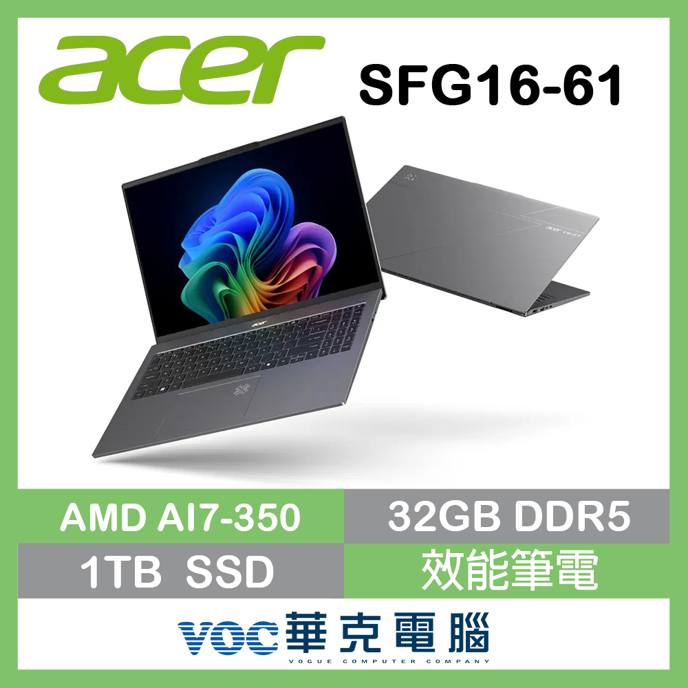 商品名 / | acer 宏碁Swift Go 16 SFG16-61-R9T6 16吋 AI筆電 灰(Ryzen AI 7 350 32G 1TB SSD OLED W11) |