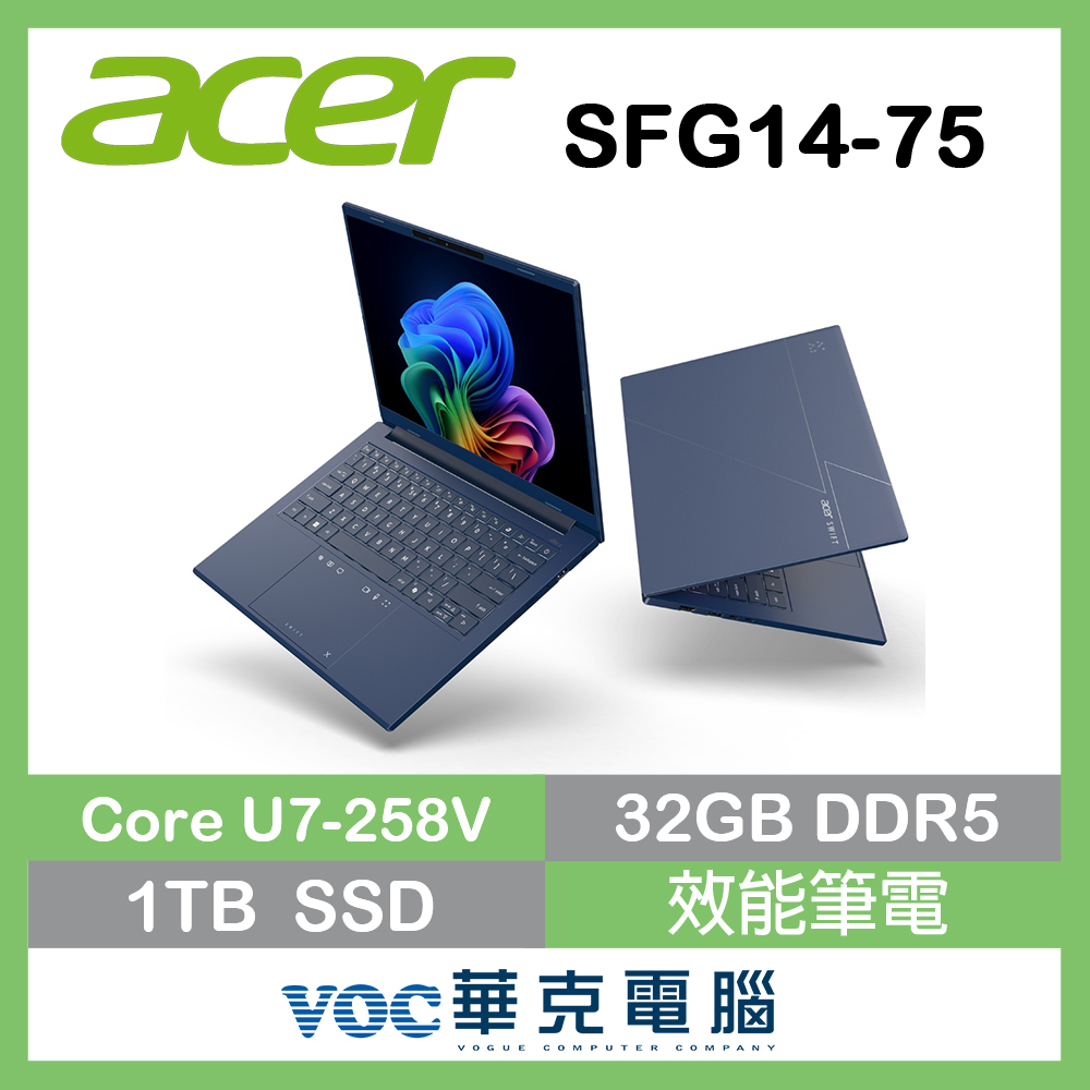 商品名 / | acer 宏碁Swift Go SFG14-75-76T1 藍色(CU7-258V 32G 1TB W11 WUXGA OLED)14吋AI效能筆電 |