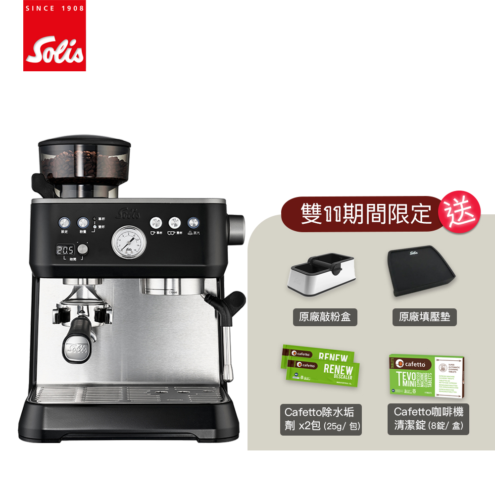 內容簡介 ✅ 榮獲2022德國紅點設計獎✅ 通過商檢局BSMI合格認證 商檢字號:R36465✅ 研磨、萃取、奶泡,一機完成✅ 45秒快速預熱✅ 磨豆系統 (低噪音、抗靜電、防飛粉)✅ 25檔研磨段數,可預設研磨時間✅ 免手持研磨✅ 萃取與蒸汽模式,切換約30秒✅ PID智能溫控系統【 產品規格 】・品牌 :Solis・型號:TYP1019・商品規格:30(W) x 38(H) x 40(D) cm・重量 :9.6 kg・電源 :110 V, 60 Hz 1500 W・水箱容量 :2.6公升・濾杯尺寸:54mm・幫浦壓力 :16 Bar・材質:不銹鋼・產地:瑞士設計,中國製造・保固期 :1年※ 正常使用下,非人為因素損壞 ,一年內零件與工時保固,寄送之運費由客戶自行負擔。※ 請注意!配件:BRITA濾水器濾芯及水質試紙凡拆封使用,如欲退貨將酌收費用。🔹 新機磨合期,把手無法轉到90度?「新咖啡機的把手較緊屬正常現象,因咖啡沖煮墊圈為橡膠製品,會根據出產年份,材質,以及使用程度,把手能上緊到90度的狀況,會有些許不同,是屬於正常情況,在把手上緊後,不發生側漏都是正常範圍。」🔹 如何改善手感?「您可以在安裝把手時,以穩定且均勻的力度轉緊,而非過度用力。使用幾次後,密封圈會稍微適應,會變得更順手。此外,確保濾杯邊緣及組件保持乾淨無粉渣,也有助於更順暢的安裝。」 ===== 保固注意事項 =====※ 除機器本身外,其餘配件視同消耗品,均不在保固範圍。※ 為了確保客戶權利,請保留產品保固書、購買證明文件或填寫線上保固等,將以主體寄出或是顧客收貨日期作為保固起始日期。※ 未經書面許可而客戶擅自或使第三人嘗試打開產品本體或添附、拆卸、擴充或更改、修復原產品設計, 或者機器序號不符之情況,我方將有權終止保固服務。※ 無提供全球保固,非我司銷售的商品,皆以過保固處理。※ 保固服務不包括運輸費用,故若有保固維修時,客戶須自行負擔運輸費用。