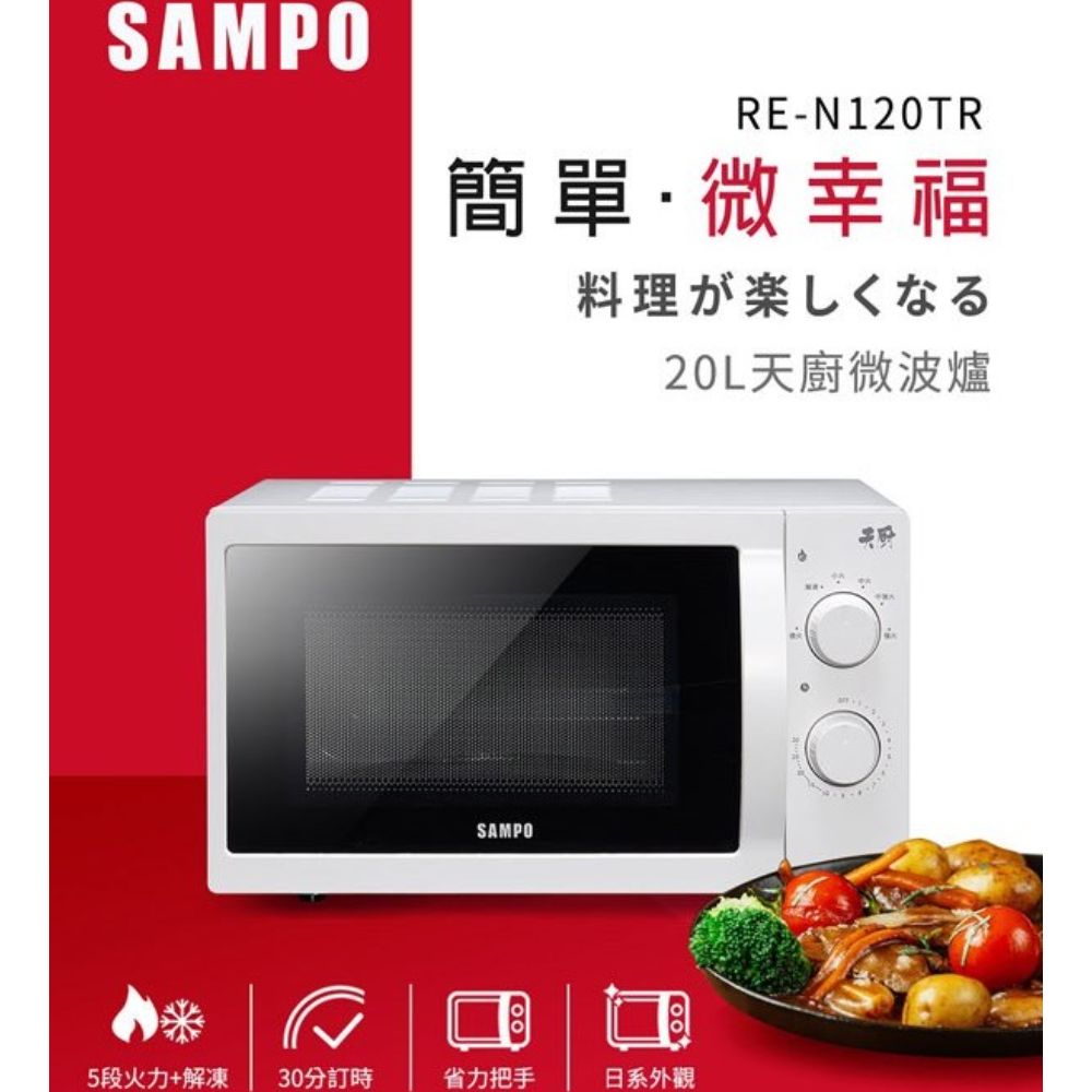 內容簡介 SAMPO聲寶 20L機械式微波爐 RE-N120TR1.日系簡約外觀,一體式省力把手好開關便於取食材2.旋鈕操作簡單方便,使用輕鬆上手3.5段火力控制,最高可達700W大火力,可依照食材所需自由調整,完整保留食物美味4.解凍功能,隨時解凍隨時料理更便利5.最長30分鐘定時,靈活設定,烹煮不受限6.防鏽防菌腔體+強化玻璃轉盤,清潔更容易7.多重安全防護,使用更安心