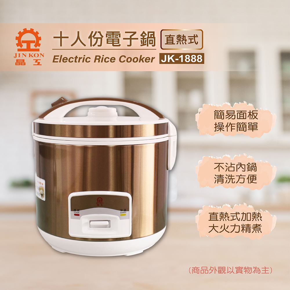 商品描述 | Jinkon晶工十人份電子鍋 JK-1888:【商品特色】*集水盒設計,讓多餘水分流出,讓米飯Q度剛好、口感更佳。*上、中、下立體放射保溫,煮好的米飯不易變黃。*全自動保溫設 |