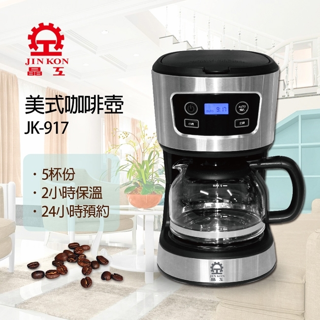 商品描述 | JINKON 晶工 5杯份美式咖啡機 JK-917:商品特色:(1)不鏽鋼裝飾面板和底座帶(2)LED顯示螢幕,藍色背光燈,開關藍燈按鍵(3)微電腦控制,24小時預約咖啡製作(4)咖啡製作完成後 |