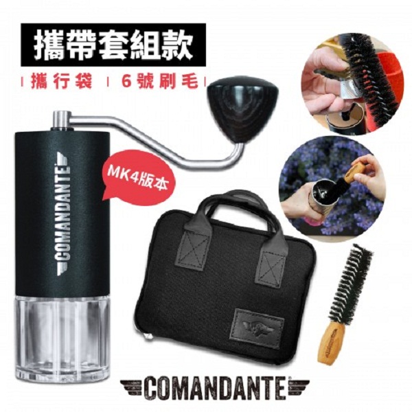 內容簡介 『C40 MK4 黑色攜帶包組合』此為C40 MK4 黑色 + 攜帶包套裝組,讓您收納、攜帶一次解決!【內容物】1.C40 MK4 手搖磨豆機 黑色*12.儲豆罐*2(透明玻璃、深色款為玻璃,深色款已裝於機上)3.攜帶包*14.原廠6號毛刷*15.防滑手環為贈品,贈完不另行通知!!【德國】COMANDANTE C40 磨豆機 《保固特此說明》因坊間眾多仿冒品、水貨等非正式總代理貨源氾濫,為保護消費者權益,即日起凡需維修保固者,請須出示保固卡以及購買來源資訊,方得以維修及保固服務,若無法出示者,恕本公司無法提供服務,務必留存好保固卡及購買明細或發票。※ MK4版本皆會客製配發保固序號,若查對有誤時,將保留後續服務權力,請務必妥善保存。● C40 MK4,將軸承重新設計,改善卡豆情形,讓使用者體驗更加完善。● 德國司令官 C40 MK4,是為頂級的咖啡愛好者與專業人士所打造的一款高性能手搖磨豆機。● 精良齒輪比的磨盤設計,表現優異的研磨品質,保留咖啡豆的香氣,讓咖啡風味清晰、層次分明。● 中央軸心由兩個微型滾珠軸承支撐固定,更加穩定且增加研磨順暢度。● 刀盤採用高氮不鏽鋼材質,(NITRO BLADE®PAT)並經硬化處理延長耐久性,可長保刀刃鋒利。● 其採用高氮馬氏體鋼(high-nitrogen martensitic steel)非常難以加工,是堅韌、高度耐磨並銳利研磨利器。● 研磨粗細對應義式濃縮ESPRESSO、摩卡壺、手沖、虹吸、壓濾壺等各式沖煮器具。● 木製手柄為100%天然橡木手工製成,包裝採用回收紙材,為環保盡一份心力。● 商品皆採用高品質塑料零件,使用安心。[ 建議研磨刻度 ]5 – 10 適用於土耳其咖啡10 – 15 適用於義式濃縮15 – 20 適用於摩卡壺20 – 25 適用於 V60 手沖濾泡25 – 30 適用於 Aeropress 以及 法式濾壓30 – 35 適用於卡爾斯巴德(Karlsbad)咖啡壺[ 產品規格 ]磨盤規格: Comandante Z15MB-V7LC-DSE-200磨盤材質:專利合金高氮不銹鋼機身材質:不鏽鋼機身外觀:高質感木、竹子貼皮(木紋等系列)握把材質:100% 天然橡木豆罐材質:深棕色玻璃、透明聚合物樹酯外盒:由可回收紙張製成產地:德國《注意事項》MK4版本配置將有所調整,內容物為Comandante C40 MK4 頂級手搖磨豆機*1、儲豆接粉罐*2(深咖啡色為玻璃材質、透明色為聚合物樹酯Polymer材質)、木珠把搖臂*1。*因產品部分零件為天然竹皮、木材製作貼合,故略有顏色或竹紋、木紋等紋理與照片顯示不盡相同,都以現貨為主,恕不另通知,另組裝與壓印logo為人工生產流程,若有小瑕疵且不影響使用之下,原廠視為正常可接受範圍,請務必下單前自行斟酌。
