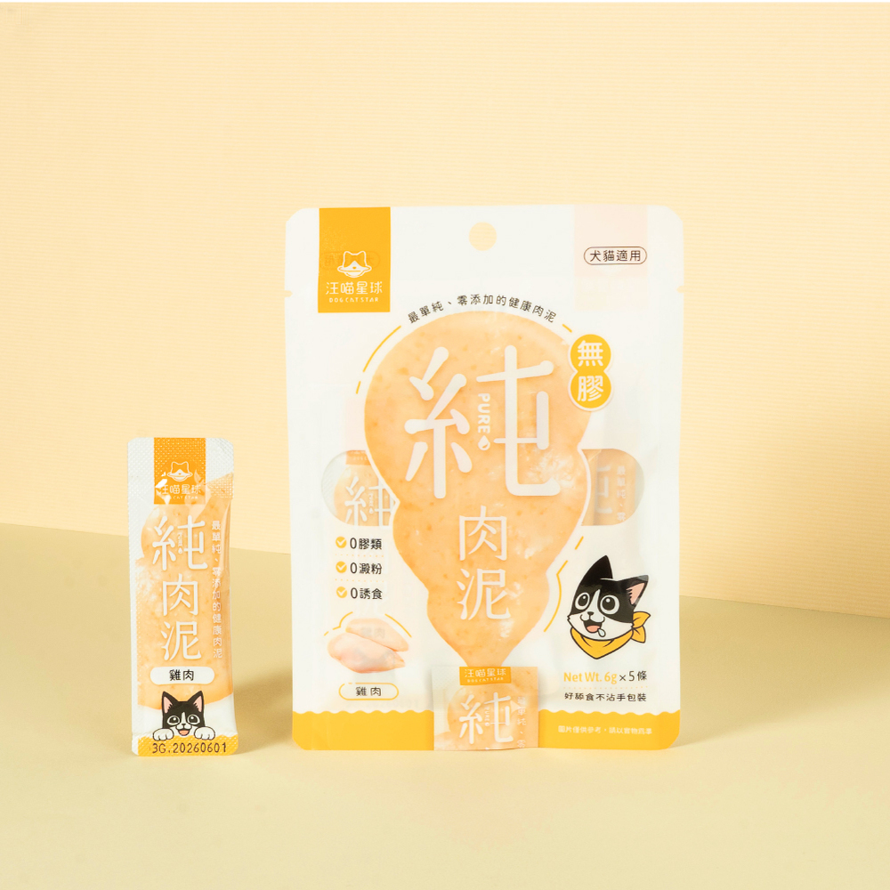 商品描述 | 汪喵星球無膠純肉泥 雞肉 6g 5條:真湯純肉0添加,停不下來的美味!【重新定義好肉泥】•成分單純,拒絕多餘添加物-0膠類:好消化、腸胃不敏感-0澱粉:降低肥胖風險- |