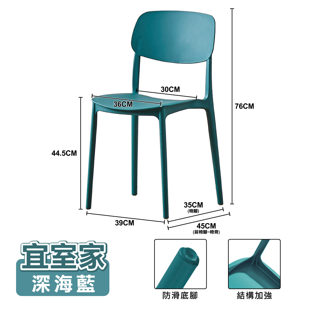 簡介 / | 【ONE HOUSE】2入_ 宜室家簡約加固靠背椅 深海藍:一體成形,穩固耐用,可疊加收納省空間。人體工學弧形靠背,貼合背部曲線,支撐更有力,加寬加大椅面。加粗加厚實心椅腳 |