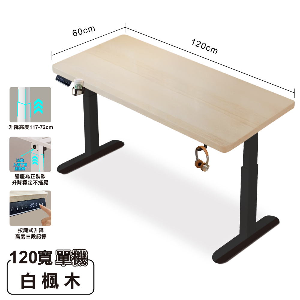 商品名 / 【ONE HOUSE】無段式阿姆斯電動升降桌120x60CM|3段記憶鍵 120寬白楓木+黑架