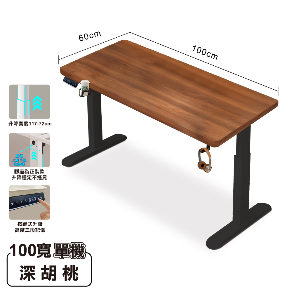 內容簡介 【購 買 需 知】⚠️此商品僅能賣家宅配。⚠️單機透過同步連動桿進行升降,因僅搭載單顆電機,長時間操作可能因高溫自動暫停,待冷卻後即可恢復正常使用。⚠️桌腳上方同步連接桿孔位,出廠時會塗抹潤滑油,以確保桌子升降順暢。少量潤滑油若滲出或沾到桌面,可用乾布或紙巾輕輕擦拭。同步連接桿穿過桌腳時可能會沾附潤滑油,屬正常現象,不影響使用。⚠️商品圖片為情境示意,僅供參考,實際商品與造型請依實物為準。⚠️因拍攝光線及螢幕顯示不同,商品可能略有色差,實際顏色請依實物為主。⚠️商品尺寸皆由手工測量,可能有些微誤差,實際尺寸請依實物為主。⚠️金屬製品在加工過程中可能會出現細微刮痕或擦痕,屬正常現象並非瑕疵,完美主義者購買前請慎思。⚠️如到貨商品不符預期或出現錯誤,請勿組裝與使用。⚠️電源輸入:AC 100-240V/頻率50-60Hz⚠️輸出電壓:DC 29.0V/1.8A⚠️無防水僅限乾燥環境使用。⚠️能效等級:符合國際能效標準 Level VI。節能環保更安心。⚠️鋼板厚度(桌腳 底座):1.2mm±5%⚠️本產品電機享有1年保固服務(在正常使用下無外力或潮濕一年內電機不良,可換電機1次請持購買發票作為保固憑證,超過一年後需要購買者需要報價出貨)⚠️開箱請錄影,保障您我權益,避免爭議。⚠️商品若有任何問題,需保留完整商品外箱及商品,做退換貨處理。⚠️賣家宅配目前沒有配送外島及離島,也沒有提供貨到付款。【注意事項】1.高壓危險,請勿用手觸碰電源線、插頭及內部電路,避免在手濕的情況中操作,防止觸電或火災風險。2.請勿在連接電源供應器時,將頭部或身體伸入桌下方,以免在未注意的情況下誤觸或啟動升降功能,造成碰撞、夾傷等危險。建議先確認桌下區域無人及無障礙物,再進行操作,以確保安全。3.請遠離火源或高溫設備,如瓦斯爐等,以免金屬導熱造成燙傷或塗層受損。4.僅限室內使用,電源無防水功能,請避免在過於潮濕、積水或有水氣凝結的環境使用,以免造成電子元件短路,影響安全與使用壽命。5.電源供應器單機款跟雙機款不可通用。並且請勿自行購買,務必使用原廠配件。6.不可自行拆卸或維修產品,非專業人員進行維修可能導致設備損壞或安全事故,若產品故障請聯繫客服協助了解。7.組裝時請確實依照說明書步驟進行。8.請定期檢查螺絲與是否有鬆動,確保使用安全。9.請勿使用強酸鹼或含腐蝕性成分的清潔劑,建議以乾布或微濕棉布搭配清水擦拭,避免使用含化學成分的濕紙巾,以延長產品壽命。【尺寸 規格】<100x60CM>桌架+100寬桌板外徑尺寸:面寬100 x 深度60 x 高度117CM±5%桌架外徑尺寸:面寬73 x 深度50 x 高度117CM±5%桌架升降高度:起始高度72~升降最高高度117CM±5%立柱尺寸:面寬4.5 x 深度6.5CM±5%桌板外徑尺寸:面寬100 x 深度60 x 厚度1.8CM±5%產品淨重:15.00KG±5%配件:桌腳x2、桌板支撐架x1、同步連動桿x1、電機x1、控制面板x1、電源供應器x1、支撐鐵片x1、杯架x1、掛勾x1、調節腳墊x4、零件包x1顏色:白楓木黑架 深胡桃黑架承重:承重上限:70KG±5%(含桌板)注意事項:1.請勿超過產品標示的承重限制,以免造成桌面變形或升降機構造損壞。2.承重數值僅為實驗測試結果,實際使用仍需視擺放方式與使用環境斟酌調整。材質:金屬+南洋楹木實木產地:中國