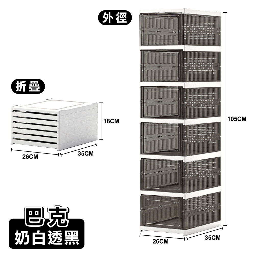 商品描述 | 【ONE HOUSE】90L巴克免組裝條紋折疊收納盒-正開款6層款 奶白透黑色 單入組:全透明高顏值收納盒,置物清楚可視,一拉及展開,無須組裝,省時省力省空間。一體式鞋盒,穩固 |