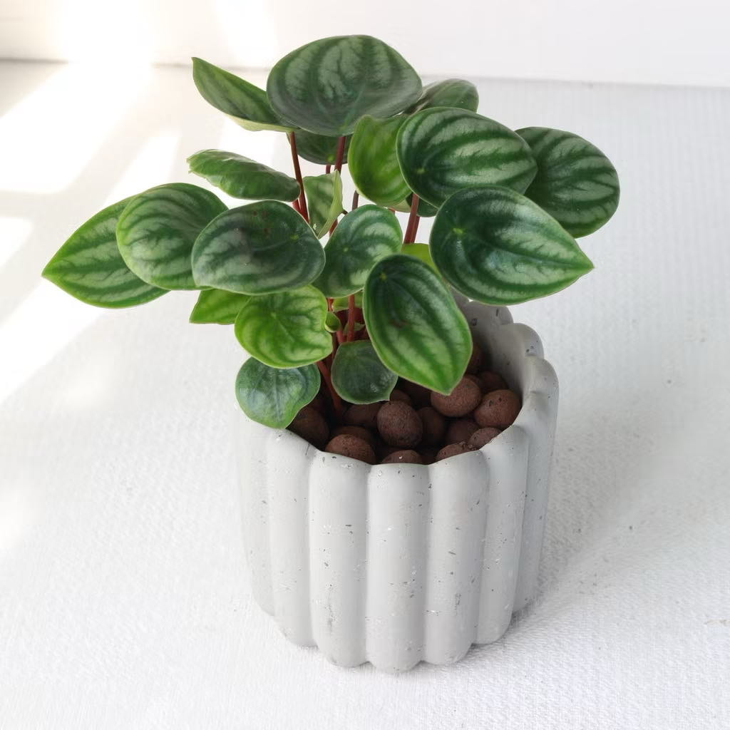 內容簡介 **西瓜皮椒草****Peperomia argyreia (Hook.f.) E.Morren**⦿ 植物西瓜皮椒草是胡椒屬多年生草本植物,終年常綠,原產南美洲和熱帶地區;因為葉片長得很像西瓜皮,所以得名西瓜皮椒草,只要養護正確很容易養出爆盆,常常有人在植物社團分享,是療癒系網紅植物⦿瓶器選擇搭配西瓜皮椒草的是手指餅乾造型的磨砂噴點水泥盆,外型新穎百搭植物,有二種顏色,白色 水泥色瓶器尺寸開口直徑 : 10.5公分高度 : 9.4公分 ⦿日照觀葉植物最好都放在散光環境,所謂的散光環境就是不是直射光,有遮蔽物的概念,比如是窗戶旁邊或有遮蔽的陽台;有些植物特別需要強光,有些植物耐陰性特別強,我們會在標題指明光照特性 ⦿給水方式 很多人問我們到底要怎麼給水?? 我們都強烈建議不要用澆的,用水盆放在植栽下方讓它自動吸水,待一兩個小時過後,再把水盆拿掉,這是一種最自然的給水方式,讓植物的根系自行吸收水分;多久澆一次水也是人們常問的,只要你摸土乾了或者植栽重量整個變輕了,就可以放上水盆讓它吸水,所有的植物都是一樣的窩當然我們也建議要適時的給植物補充營養,一個月給一次到兩次營養液是很洽當的窩,只要把營養液滴在水盆哩,一百CC一滴讓植物根系自動吸收就可以囉