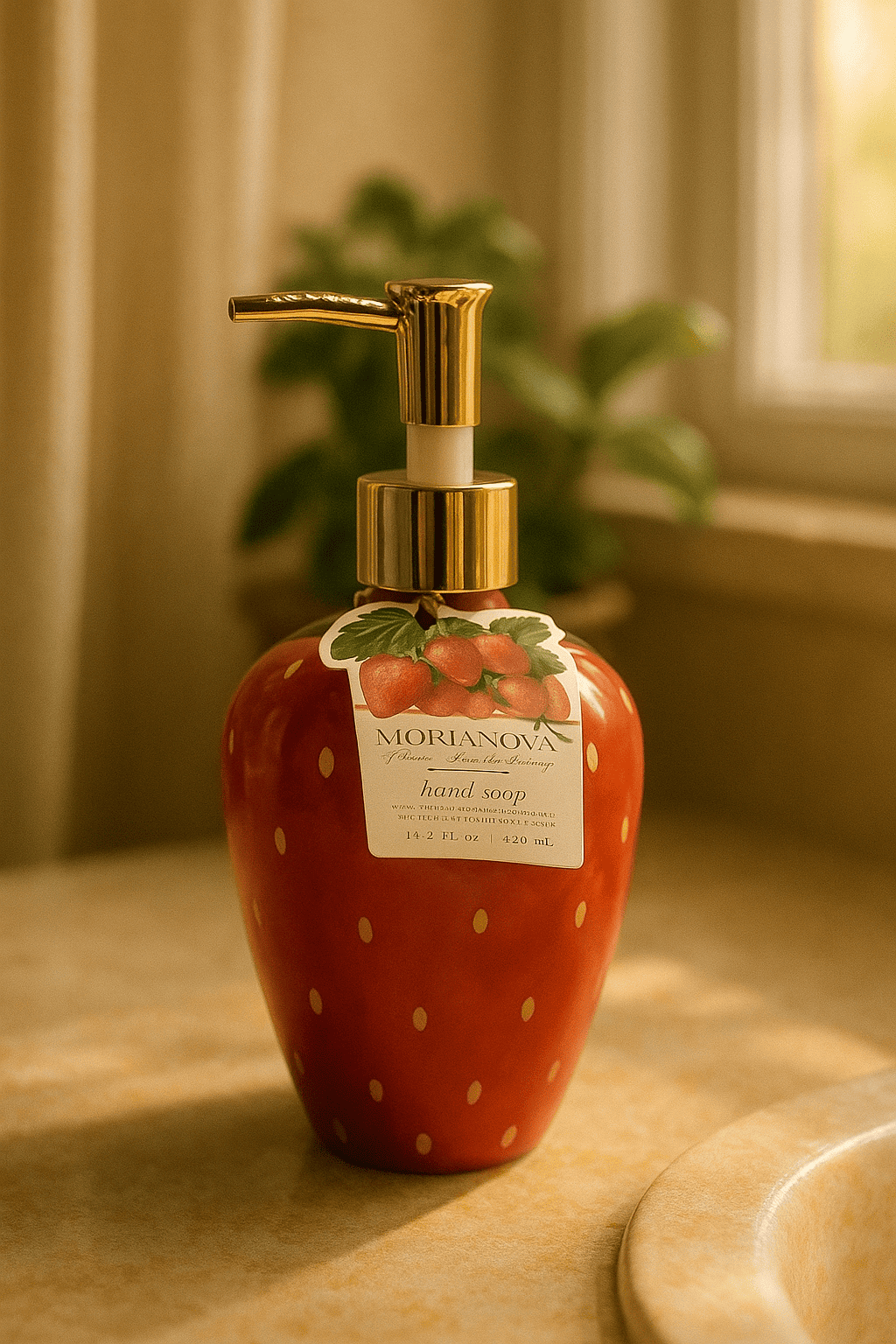 商品描述 | Morianova 甜潤草莓陶瓷洗手液 420ml:🍓【Morianova草莓微甜沐浴液】在掌心綻放第一顆春日果實🍓香味筆記|草莓軟晨前調|熟草莓的清爽甜香,像清晨第一口果昔的輕盈中調 |
