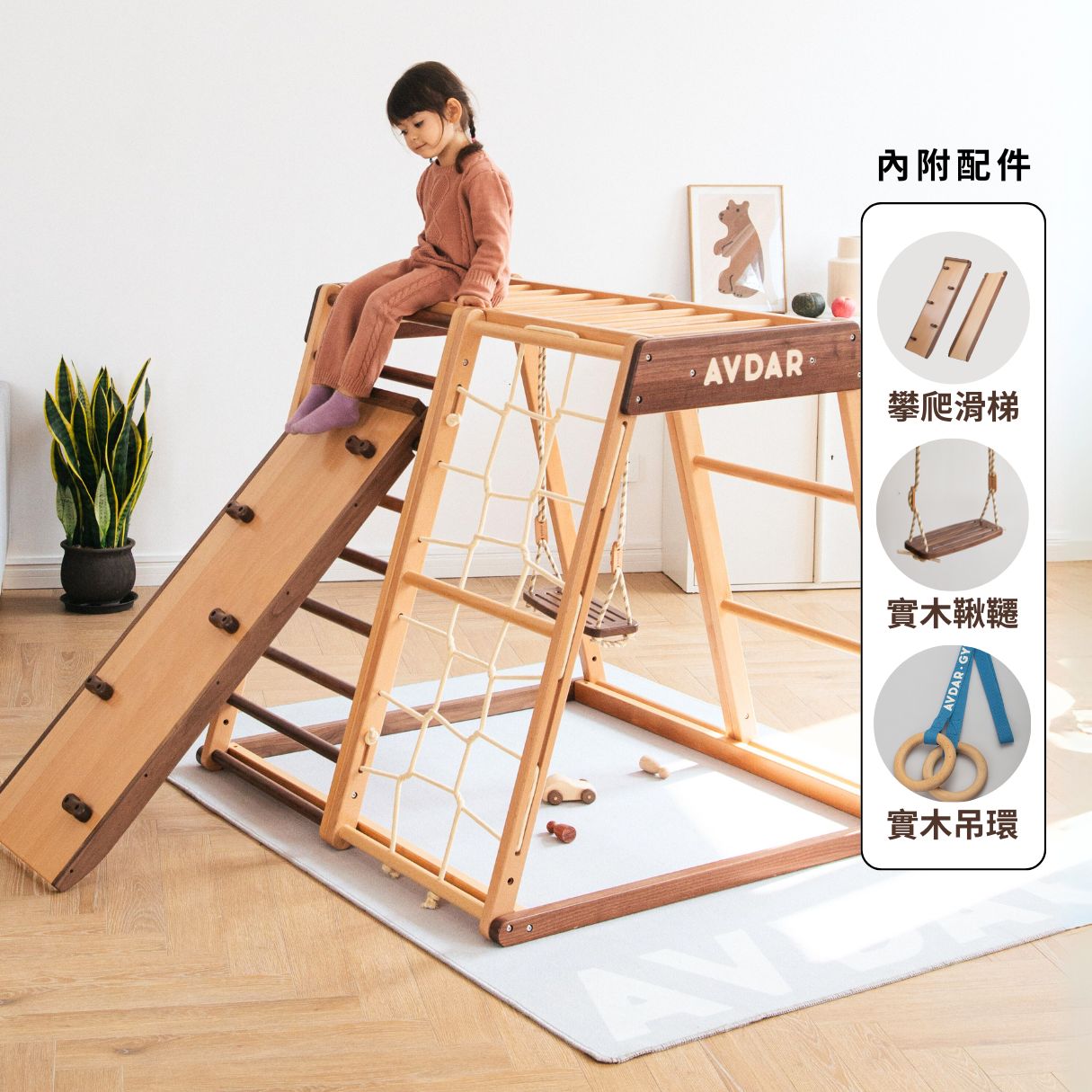 | 商品描述 | AVDAR 兒童攀爬架【誠品獨家特惠組-吊床組】|黑胡桃珍藏款:【超級放電神器】AVDAR櫸木彩虹款攀爬架,內附孩子最愛的◆鞦韆◆滑梯◆吊環,不論晴雨在家也能開心放電。每天 |