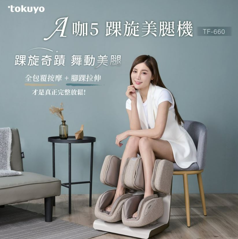 商品描述 | tokuyo A咖5 踝旋美腿機 TF-660(奶茶棕):🔸全包覆按摩+腳踝拉伸🔸轉腳踝會鬆-獨特Ω迴旋設計🔸按足底會鬆-螺旋推揉按摩🔸揉小腿會鬆-氣囊x滾輪x凸點🔸直立翻轉,按大腿🔸36 |