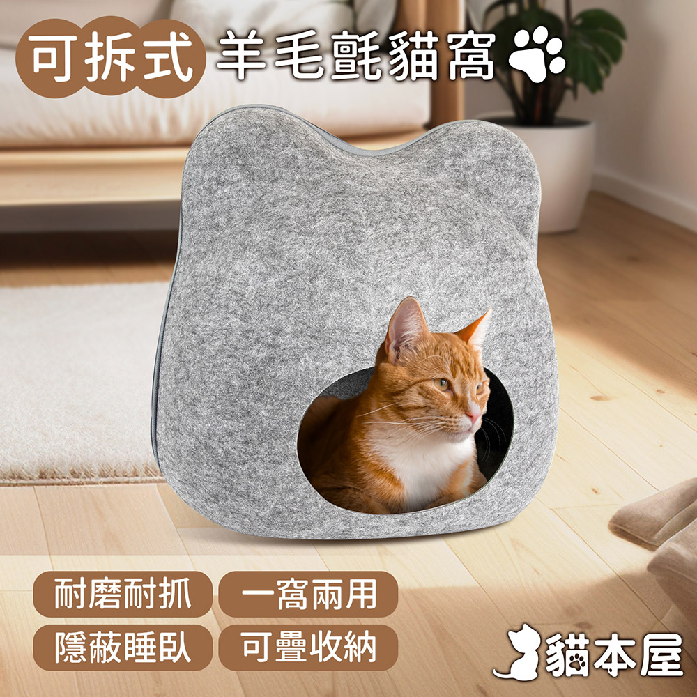 貓本屋 四季通用 貓頭造型可拆式羊毛氈貓窩 淺灰