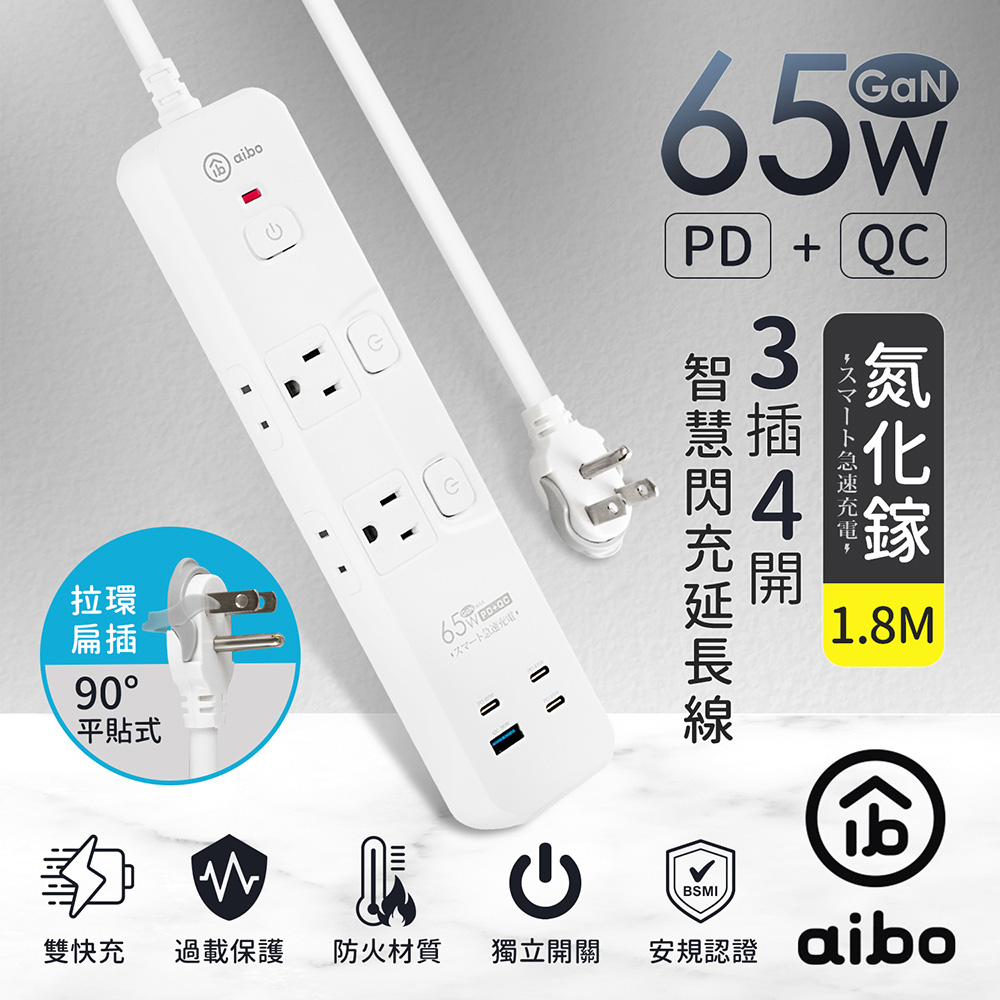 內容簡介 aibo 3開4插 GaN氮化鎵PD65W智慧快充延長線-1.8米 --3P+2P四插座,PD QC 3.0雙快充,GaN氮化鎵穩定性好----安規認證合格安全使用,投保仟萬產品責任險-- GaN氮化鎵芯片,支援高功率輸出,溫控及穩定性更好,實現更高效能更好!PDx3+QCx1,二種快充規格孔,可同時支援多裝置充電,讓充電更有效率更省時。備智慧識別晶片,主動識別充電設備,調整充電速度,支援5V 9V 12V 15V 20V電壓,貼心多重保護裝置,您的設備提供完美保護! 機體採用PC防火材質,堅固、強韌、不易自燃,使用上更放心。額定容量15A 1650W MAX,超出負載自動斷電保護,使用安全又便利,有效降低火災隱患,安全感滿分! 正、側立體插座,正面3P插座x2,側面2P插座x2,使插座使用時,不互相干擾,搭配平壓式開關,有效防誤觸,美觀又安全,使用更方便。90度貼壁拉環扁插,貼壁不占空間,輕鬆遊走於狹小空間。總電源開關設計,一鍵可管理所有電源,讓您安心使用。 本產品通過經濟部商檢局安規認證(R31554 RoHS),並投保仟萬產品責任險,讓您使用有保障,放心用電安心無虞! ※Type-C單埠最大輸出功率為65W,QC3.0單埠最大輸出功率為36W, 使用多孔同時連接時,孔位電流輸出分配請詳閱內文或說明書。※Type-C孔不支援無協議充電,若設備本身未具備PD充電協議時, 請改用USB孔充電。